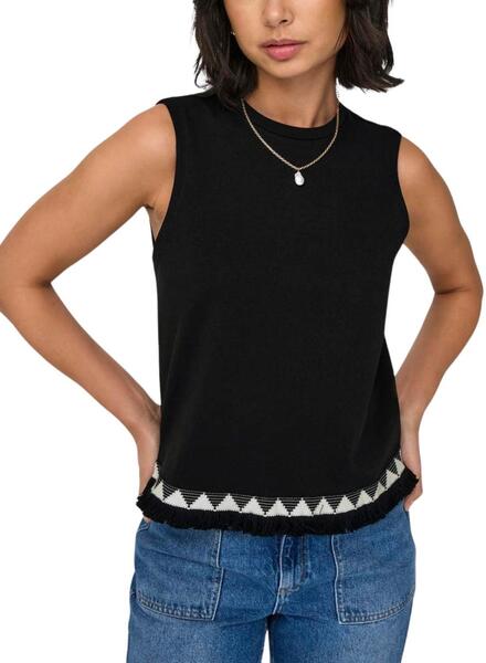 Top Only. Modelo Liva. Color negro. Cuello redondo. Sin mangas. Ajuste regular. Bajo deshilachado. Cenefa etnica en el bajo.