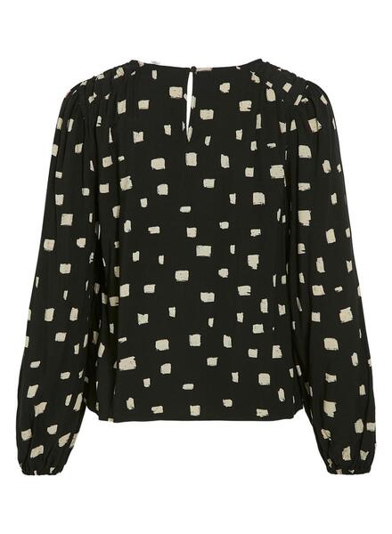 Blusa Vila. Modelo Vilana. Color negro. Cuello redondo. Mangas con volumen. Extremos de mangas elásticos. Cierre con boton en la espalda. Estampado geométrico en color blanco.