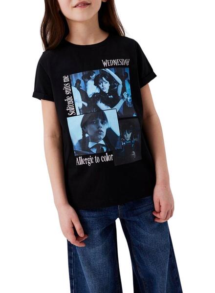 Camiseta Name It. Modelo Jax. Color negro. Cuello redondo. Manga corta. Ajuste amplio. Imágenes de Miércoles estampadas en el delantero. Detalles en azul.