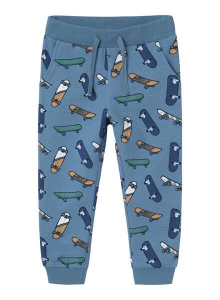 Pantalón chándal Name It. Modelo Kuno. Color azul. Cintura elastica con cordon. Bajo con puño. Estampado de skate.
