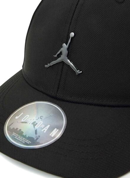 Gorra Jordan. Modelo Jumpman Metal Curve Brim. Colo negro. Diseño de seis paneles. Visera curvada. Banda de algodón para el sudor. Cierre con correa ajustable. Detalle de logotipo en metálico. Repelente al agua. Lavar a mano.