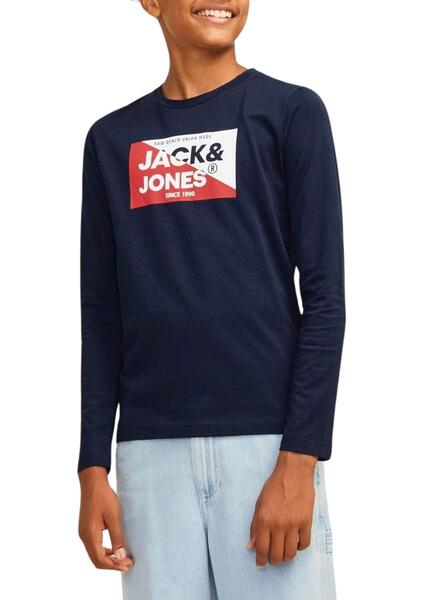 Camiseta Jack and Jones. Modelo Nolan. Color azul marino. Cuello redondo. Manga larga. Marca estampada en el pecho. Detalles en rojo y blanco.