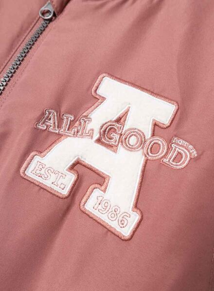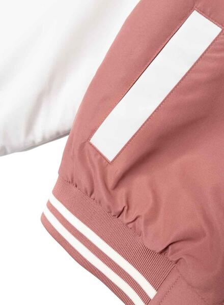 Cazadora Name It. Modelo Main. Estilo bomber. Color rosa con mangas en blanco. Letra A bordada en el pecho. Cierre con cremallera. Bolsillos laterales. Extremos elásticos con franjas. Cuello redondo con canalé.