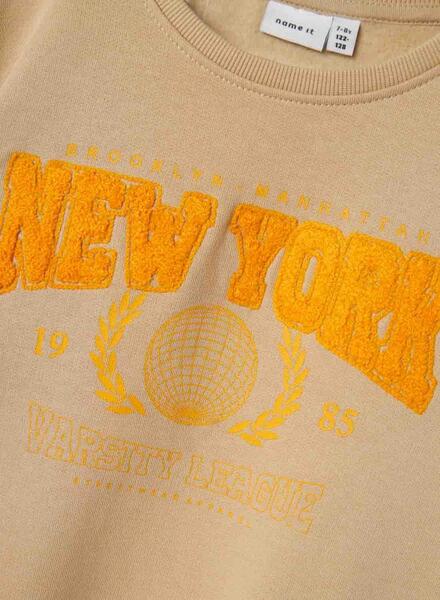 Sudadera Name It. Mdoelo Lamane. Color beige. Letras New York en amarillo. Cuello redondo. Extremos elásticos. Ajuste regular.