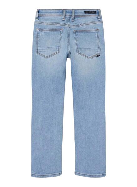 Pantalón Name It. Modelo Ryan. Denim claro con efecto lavado. Corte recto. Cinco bolsillos. Cierre de gancho y cremallera. Cintura ajustable en el interior con goma.