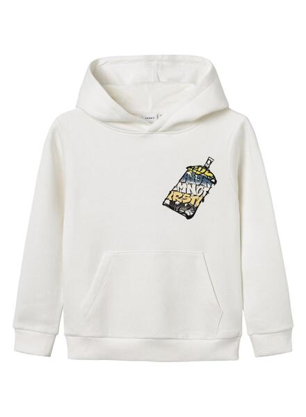 Sudadera Name It. Modelo Lube. Color blanco. Extremos elásticos. Con capucha. Ajuste regular. Ilustración estilo grafitti en el pecho y en la espalda.