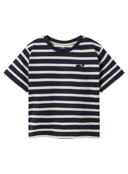 Camiseta Name It. Modelo Torine. Color azul y blanco. Estampado con rayas horizontales. Logo bordado en el pecho.