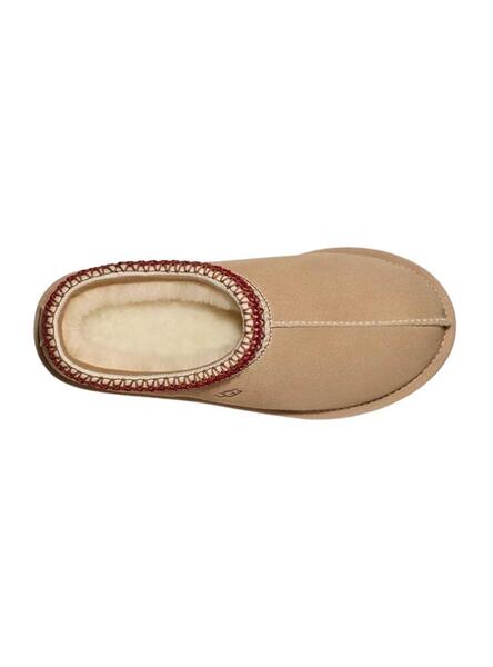 Zapatos slipper UGG. Modelo Tasman. Color beige. Forradas con lana natural. Confeccionadas con ante. Ribete con un motivo trenzado. Plantilla de lana UGGpure. Suela de Treadlite. Diseño semidescalzo. Logo grabado. Detalles en granate.