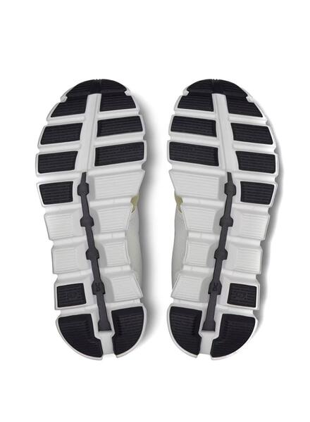 Zapatillas On Running. Modelo Cloud 5. Color blanco y verde. Cierre con cordones. Logo lateral. Transpirables. Parte superior de malla antimicrobiana. Sujeción del talón. Material: 44% material reciclado.