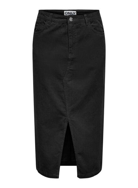 Falda Only. Modelo Moxie. Color negro. Tiro alto. Cierre de boton y cremallera. Corte midi. Abertura frontal. Bolsillos traseros de parche. Bolsillos laterales. Tejido de pana.