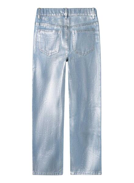 Vaquero Name It. Corte recto. Cierre con botones de presión y media bragueta en tallas 80 a 110. Cierre con botón de gancho y cremallera en tallas 116 a 164. Estampado metalizado para apariencia brillante. Efecto de revestimiento y abrasiones sutiles.