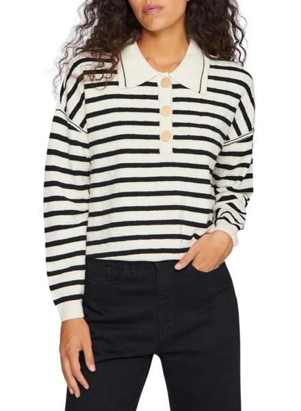 Jersey Vila. Tejido de punto. Manga larga. Hombros caídos. Estampado de rayas. Cuello con tres botones dorados. Corte regular. La modelo lleva la talla S.