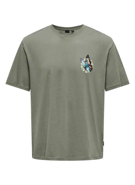 Camiseta Only and Sons. Modelo Keane. Color verde. Ilustración mariposa estampada en la espalda y en el pecho. Ajuste holgado. Manga corta.