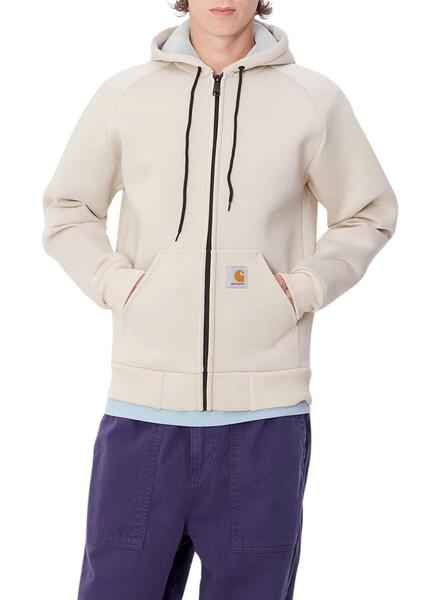 Chaqueta Carhartt. Modelo Car Lux. Color beige. Capucha con cordón ajustable. Cierre con cremallera. Bolsillos laterales. Etiqueta tejida de la marca. Extremos elásticos. Tejido tipo neopreno.