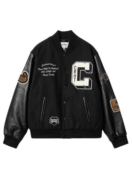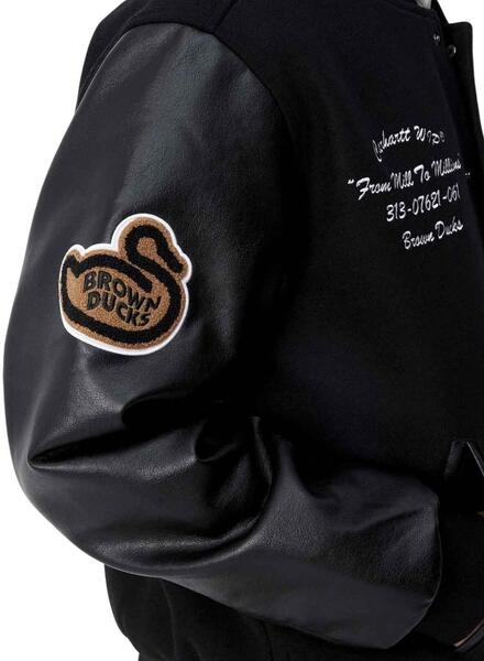 Cazadora Carhartt. Modelo Brown Ducks. Estilo bomber. Color negro. Mangas de polipiel. Cuerpo en tejido con lana. Cierre de botones automáticos. Extremos elásticos. Bolsillos laterales. Parches decorativos de la marca. Mensaje bordado en la espalda. Detalles en marrón. Forro interior.