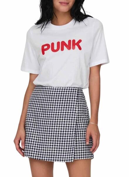 Camiseta Only. Modelo Celia. Color blanco. Cuello redondo. Manga corta. Ajuste regular. Mensaje PUNK estampado en el pecho. Detalles en fucsia.