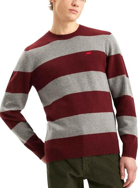 Jersey Levis. Estampado de rayas. Cuello redondo. Manga larga. Color gris y granate. Logo de Levis en el pecho. Terminaciones acanaladas. Formato regular. Tejido con lana. El modelo lleva la talla M.