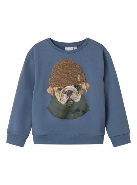 Sudadera Name It. Modelo Radek. Color azul. Puños y bajo acanalados y elásticos. Estampado frontal de goma. Cuello redondo. Sin capucha.