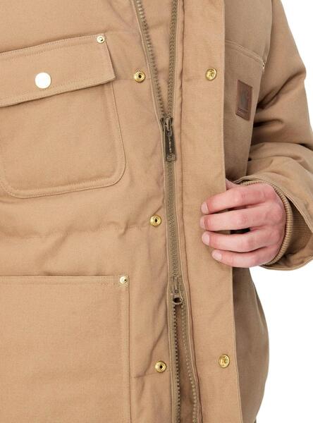 Cazadora Carhartt. Modelo Rayley. Color tostado. Tejido acolchado. Cierre con cremallera y botones automáticos. Bolsillos laterales de parche. Bolsillo de parche en el pecho con etiqueta de la marca. Bolsillo en el pecho con tapeta. Cuello de pelo desmontable. Bajo ajustable con cordón. Extremos de manga elásticos.