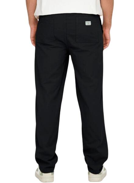 Pantalón Only and Sons. Modelo Sinus. Color negro. Cintura de goma ajustable con cordones. Bolsillos delanteros alargados. Corte holgado. Bolsillos traseros cuadrados. Etiqueta de la marca cosida en un bolsillo trasero.