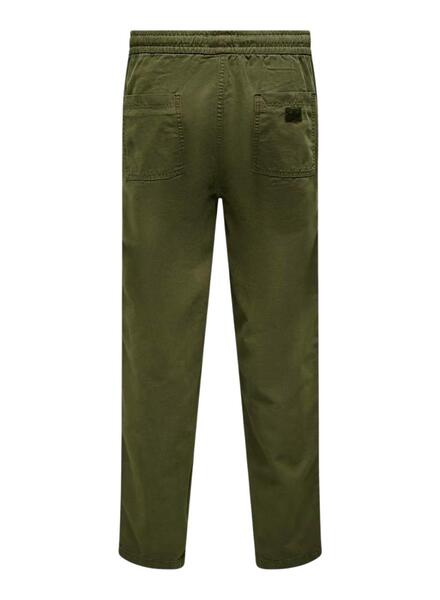 Pantalón Only and Sons. Tejido suave. Color verde. Cintura elástica con cordones. Bolsillos delanteros. Corte holgado. Bolsillos traseros cuadrados. Etiqueta de la marca cosida en un bolsillo trasero.