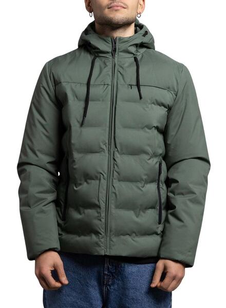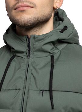 Cazadora Klout. Modelo Vitoria. Acolchada. Color verde. Capucha con cordones en color negro. Cierre con cremallera. Formato regular. Bolsillos laterales con cremallera. Bolsillo en el pecho con cremallera. Bajo estástico ajustable. Parche redondo de la marca en una manga. El modelo lleva la talla M. Fabricada y diseñada en España.