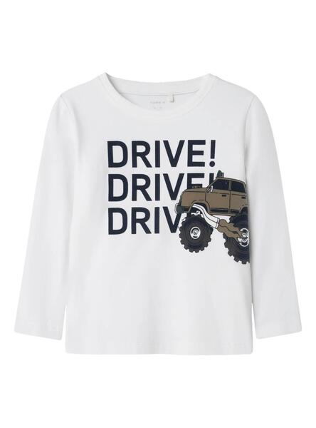 Camiseta Name It. Modelo Sebber. Color blanco. Cuello redondo. Manga larga. Ilustración con mensaje estampada en el delantero.
