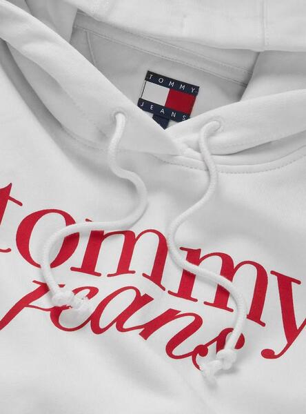 Sudadera Tommy Jeans. Modelo Ess Logo. Color blanco. Manga larga. Bolsillo canguro. Estampado de la marca en el pecho. Capucha ajustable con cordón. Regular fit.