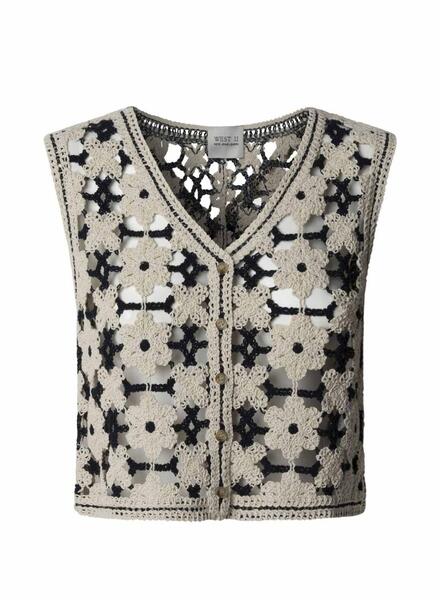 Chaleco Pepe Jeans. Modelo Olivia. Tejido de crochet. Escote en pico. Cierre con botones. Color blanco roto y azul marino. Patrón floral.