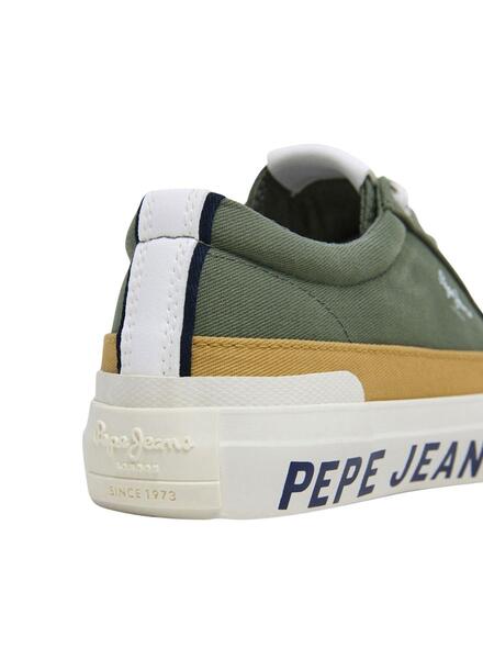 Zapatillas Pepe Jeans. Modelo Ben. Color verde. Cierre conc ordones. Suela de goma con marca XL estampada. Logo lateral. Parte superior en loneta verde y mostaza.