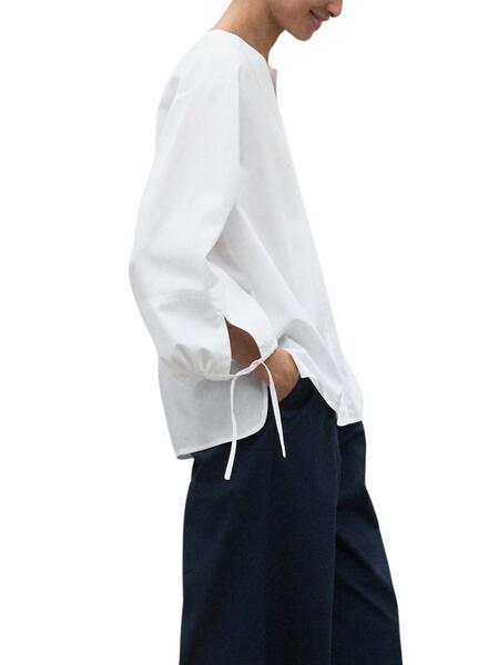 Camisa Ecoalf. Color blanco. Manga larga. Mangas con ajuste de cordón. Cuello redondo con abertura en V. Corte holgado. La modelo lleva la talla S.