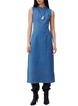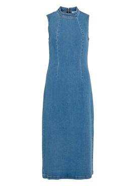 Vestido Vila. Tejido denim. Formato midi. Sin mangas. Cuello alto. Cierre de cremallera en la parte posterior. Formato ajustado. La modelo lleva la talla S.