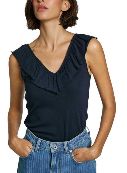 Top Pepe Jeans. Modelo Millie. Color marino. Escote en V. Espalda abierta. Sin mangas. Detalles de volantes.