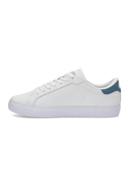Zapatillas Lacoste. Modelo Powercourt. Color blanco. Talonera en color azul. Parte superior de piel. Perforaciones centrales. Suela de caucho flexible. Cocodrilo bordado en el panel central.