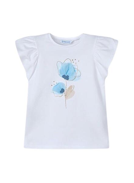 Camiseta Mayoral. Color blanco. Mangas con volantes. Flor en relieve en la parte delantera.