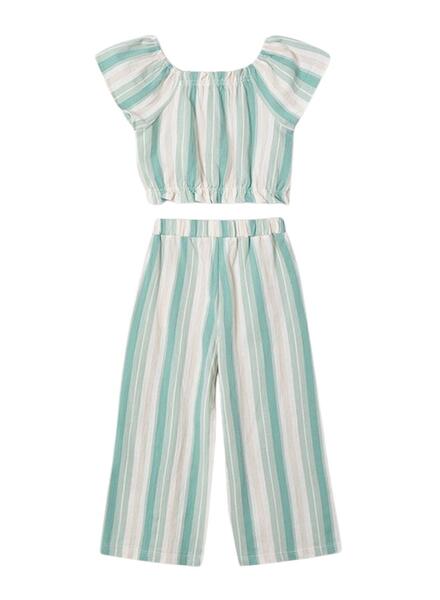 Conjunto Mayoral. Estampado de rayas verdes. Camiseta manga corta. Cintura y cuello con goma. Formato corto. Pantalón ancho. Cintura de goma. Bolsillos laterales. Largo crop.