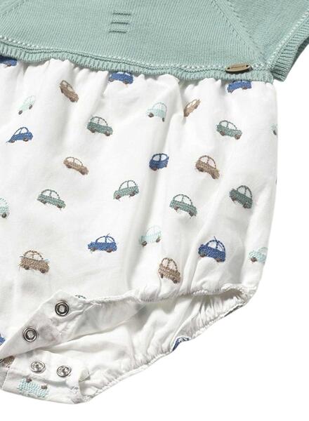 Pelele Mayoral. Cuello redondo. Parte superior de punto. Color verde. Cierre con botones. Parte inferor con estampado de coches. Cierre trasero con botones.