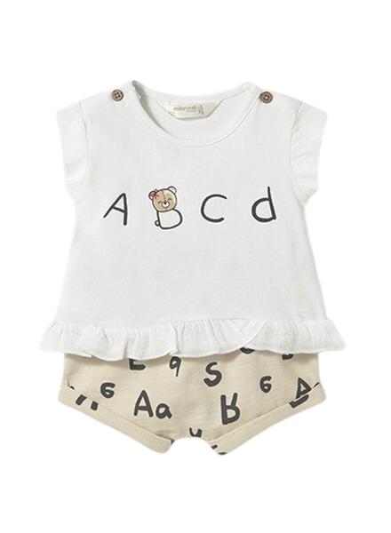 Conjunto 4 piezas Mayoral. Dos camisetas con estampados diferentes. Dos pantalones cortos. Uno con estampado de letras. El segundo liso. Tejido suave y cómodo.