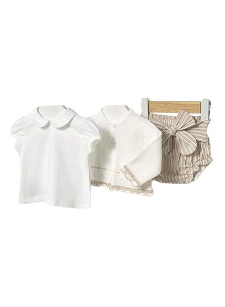 Conjunto 3 piezas Mayoral. Blusa blanca manga corta. Chaqueta de punto suave. Color beige. Manga larga. Cierre con dos botones. Short con estampado de rayas. Color tostado. Lazo grande en la parte delantera. Cintura de goma.