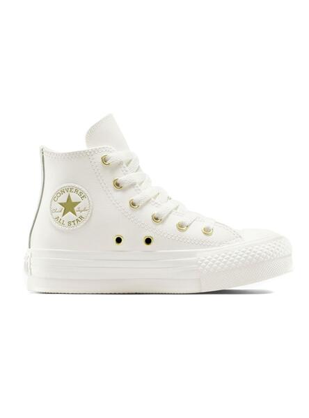 Zapatillas Converse. Modelo Chuck Taylor All Star Eva Lift Hi Leather. Color blanco. Parte superior de piel. Cierre de cordones con ojales dorados. Silueta alta. Confeccionadas en cuero. Suela exterior ligera con plataforma. Amortiguación de espuma suave. Detalles dorados.