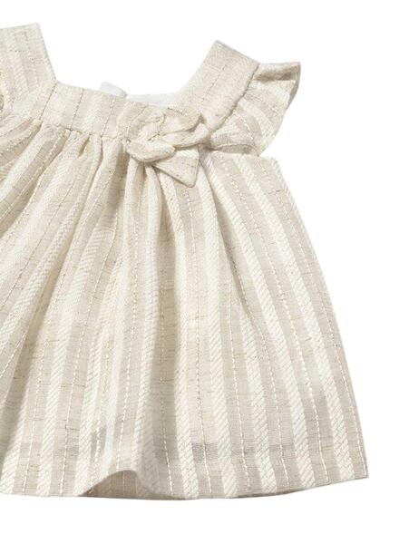 Vestido Mayoral. Modelo ceremonia. Color beige. Escote cuadrado. Detalles con volantes. Con cubrepañal. Estampado de rayas beige y blanco.