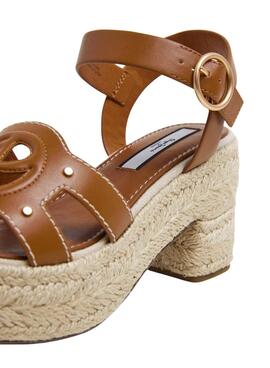 Sandalias Pepe Jeans. Modelo Gladys. Color marrón. Efecto piel. Tacón alto de 9cm. Plataforma de 4cm. Cierre con hebilla metálica en el tobillo. Monograma en ek empeine. Tachuelas decorativas. Entresuela de cuña en yute natural y suela de EVA con labrado antideslizante.