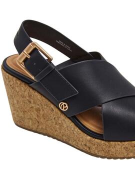 Sandalias Pepe Jeans. Modelo Wayna Cross. Color negro. Cuña en corcho natural. Tiras anchas cruzadas en empeine. Cierre con hebilla metálica en el tobillo. Monograma metálico en el lateral. Plantilla acolchada. Suela de goma con labrado antideslizante. Altura de la cuña: 9cm en su parte más alta.