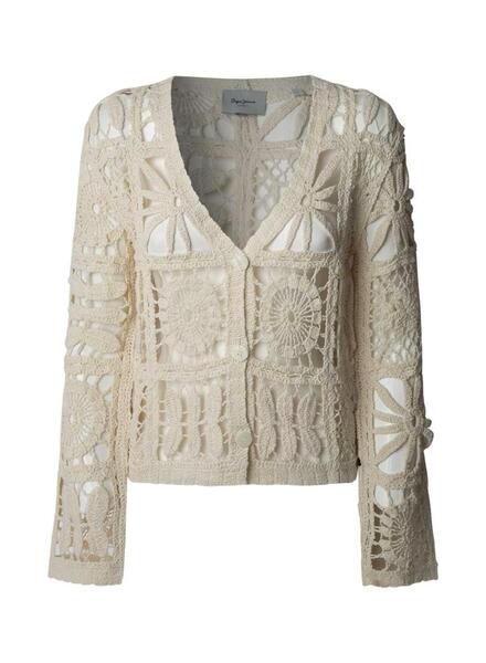 Chaqueta Pepe Jeans. Modelo Olympia. Color blanco roto. Cierre con botones. Escote en pico. Manga larga. Ajuste regular. Tejido calado con detalles geométricos. Ajuste regular.