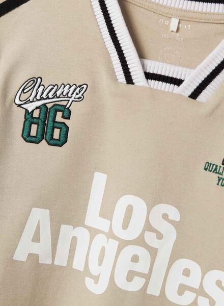 Camiseta Name It. Modelo Damas. Color beige. Cuello redondo con banda en color blanco y azul. Logos bordados en el pecho. Ajuste holgado. Manha corta. Estilo deportivo.
