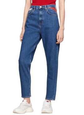 Pantalón vaquero Tommy Jeans. Modelo Mom. Color blanco. Tiro alto. Cierre con botón y cremallera. Cinco bolsillos. Ajuste Mom. Estilo vintage. Largo por los tobillos. Logo bordado en el bolsillo monedero y en el bolsillo trasero. Parche de la marca en la cintura.