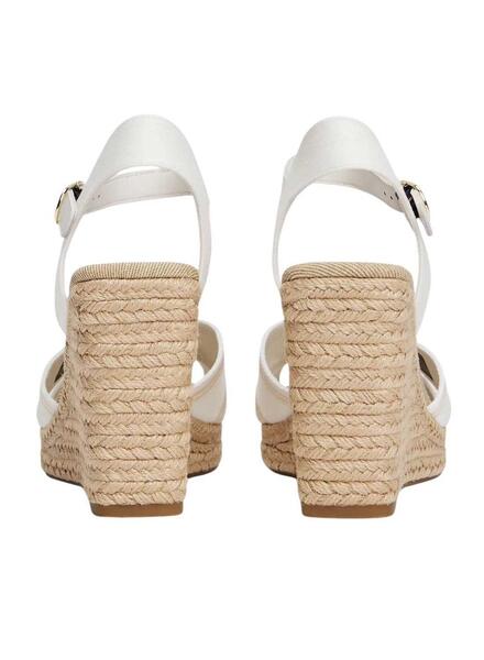 Sandalias Tommy Jeans . Modelo Monotipo. Color blanco. Estilo alpargata de cuña. Parte superior cruzada con marca estampada en dorado. tira de succión en el tobillo. Puntera recta. Suela de goma. Entresuela estilo yute. Altura del tacón de 10 cm. Altura de la plataforma de 2,2 cm.