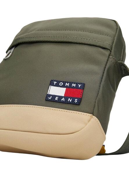 Bolso Tommy Jeans. Modelo Dailt Reporter. Bicolor. Color verde y beige. Cierre con cremallera. Bolsillo exterior. Parche de la marca bordado. Tejido de loneta reciclado. Correa de hombro ajustable. Capacidad de 2.8 litros. Dimensiones: 16.5 x 6 x 20.5cm.