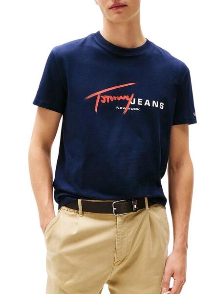 Camiseta Tommy Jeans. Modelo Signature. Color azul marino. Cuello redondo. Manga corta. Ajuste regular. Bandera bordada en la manga. Logo estampado en el pecho con detalles en rojo y blanco.
