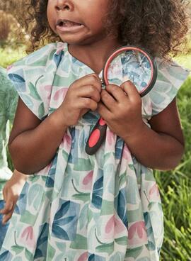 Vestido Mayoral. Estampado de flores. Color azul, verde, blanco y rosa. Cuello en V. Cierre con botones. Volantes en las mangas. Tejido fluido.